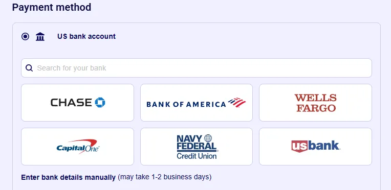 - Bank Account (US Bank): Click your bank name and log in, or select Enter Bank Details Manually (below the bank icons).