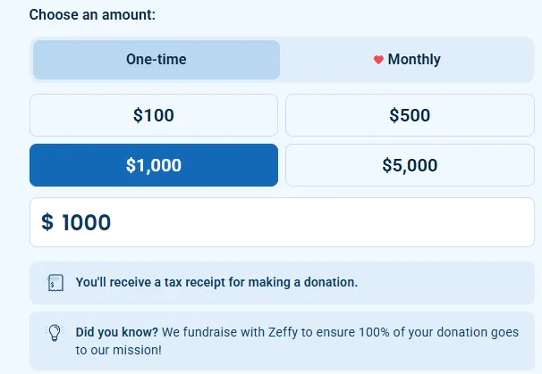 We use Zeffy, an absolutely free donation platform designed for nonprofits. Before you donate, please review the instructions below. There are a couple of quick steps you’ll need to follow to ensure no fees are added to your donation. Because Zeffy is 100% free for nonprofits, we are able to keep every dollar you give without paying any fees — meaning your full donation supports our community.