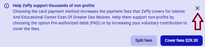 If you’re paying by card, click the X next to the fee to deny/waive it.